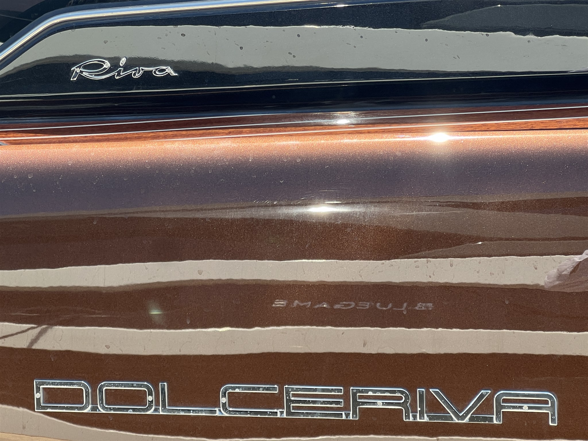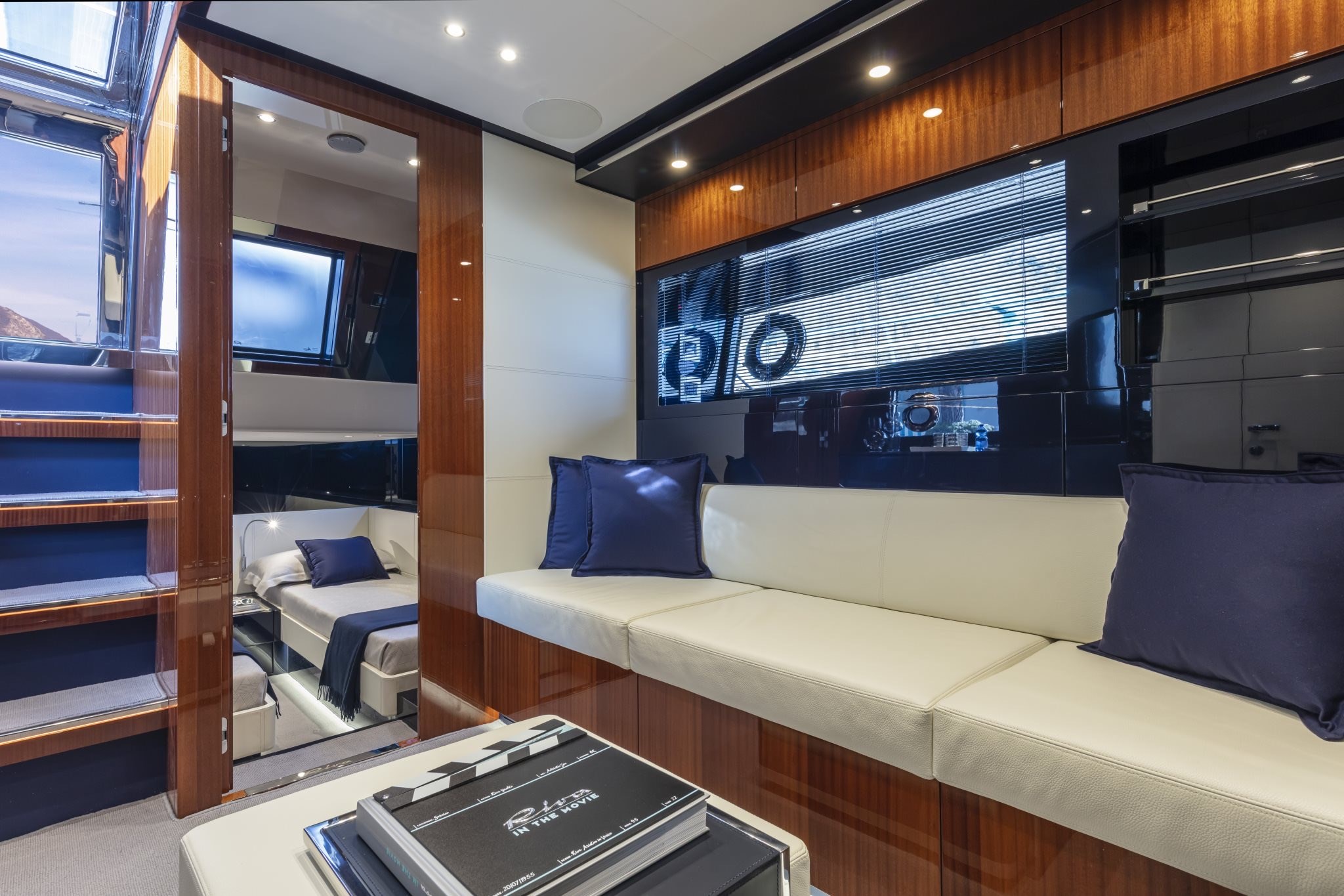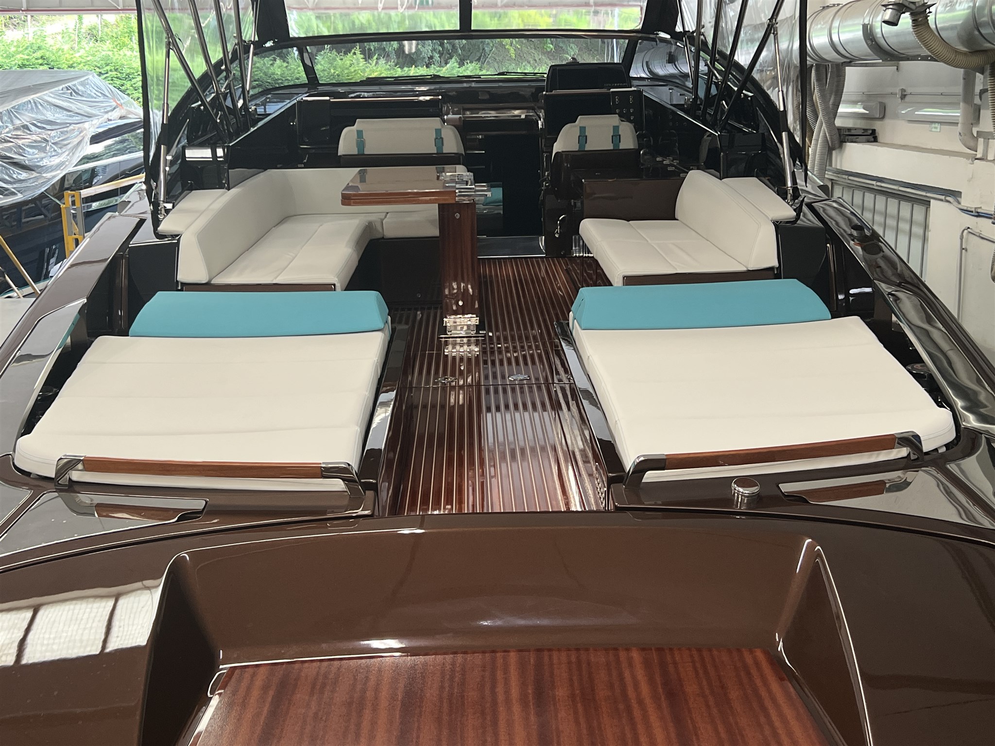 COLORE SCAFO SPECIALE CHOCOLATE BROWN, CUSCINERIE BIANCHE CON DETTAGLI TURCHESI, INTERNI IN MOGANO LUCIDO, QUOIO COLOR TABACCO E LACCATURE BLUE NAVY