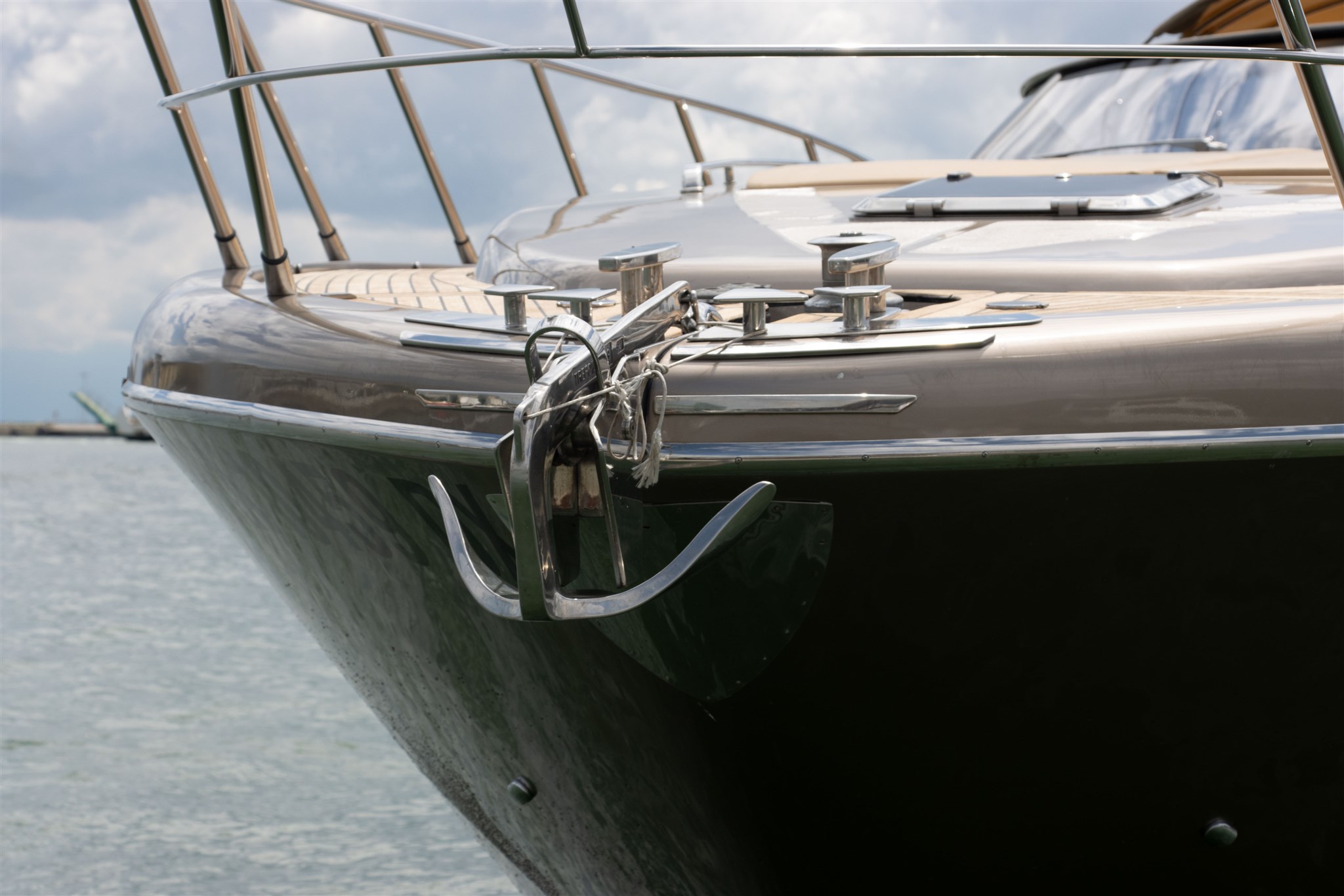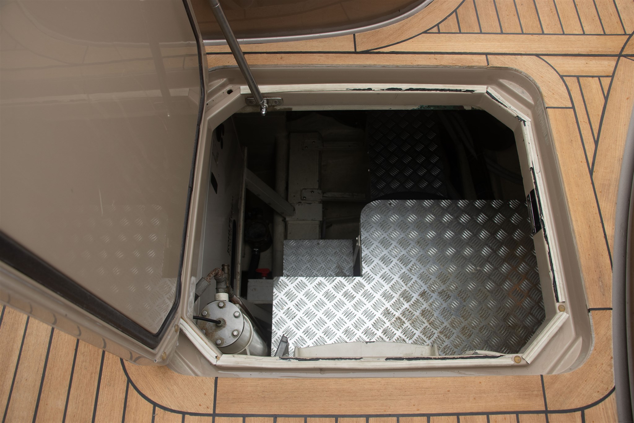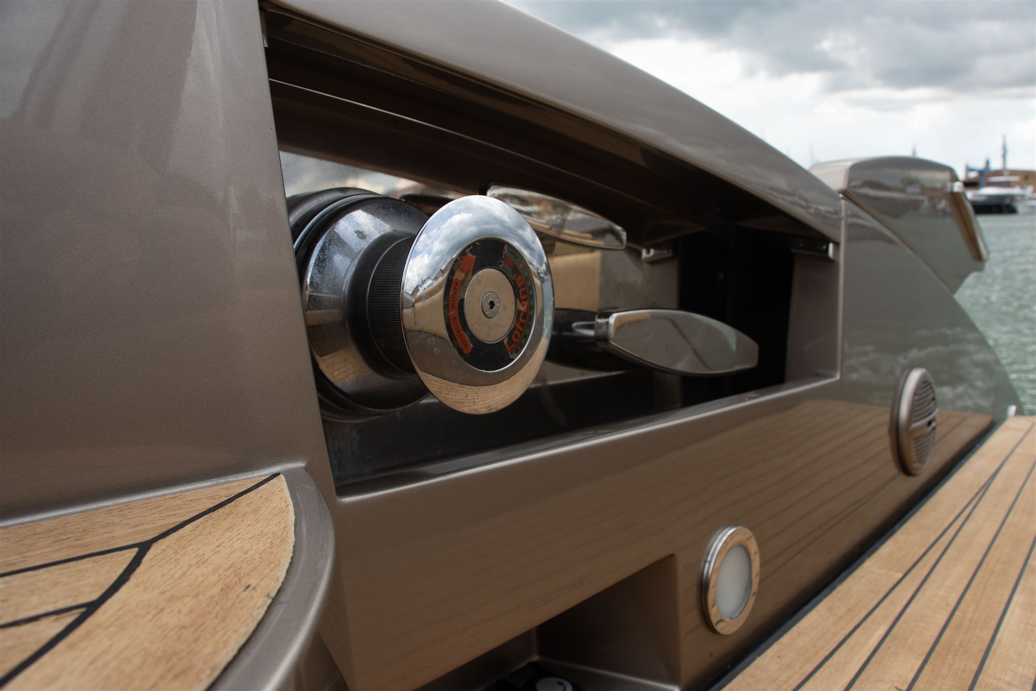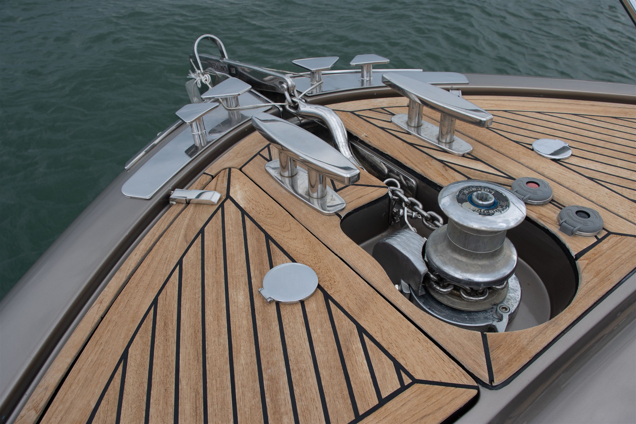 Allarme motore, Allarme sentina, Alternatore, Ancora, Autoclave, Batterie, Caricabatterie, Cavo corrente di banchina, Corrimano, Doccia esterna, Elica di poppa - stern thruster, Elica di prua - bow thruster, Fissaggio dell’ancora, Flap elettrici, Flap idraulici, Garage per tender, Indicatori Flaps, Lavandino nel Pozzetto, Luci di cortesia, Passerella, Pompa di sentina automatica, Pompa di sentina elettrica, Pompa Lavaggio Ponte, Pozzetto Teak, Presa 220V banchina, Presa acqua banchina, Salpa Ancore Elettrico, Scaletta da bagno, Tavolo pozzetto, Tientibene con cancelletti, Tromba, Winch Elettrico.
