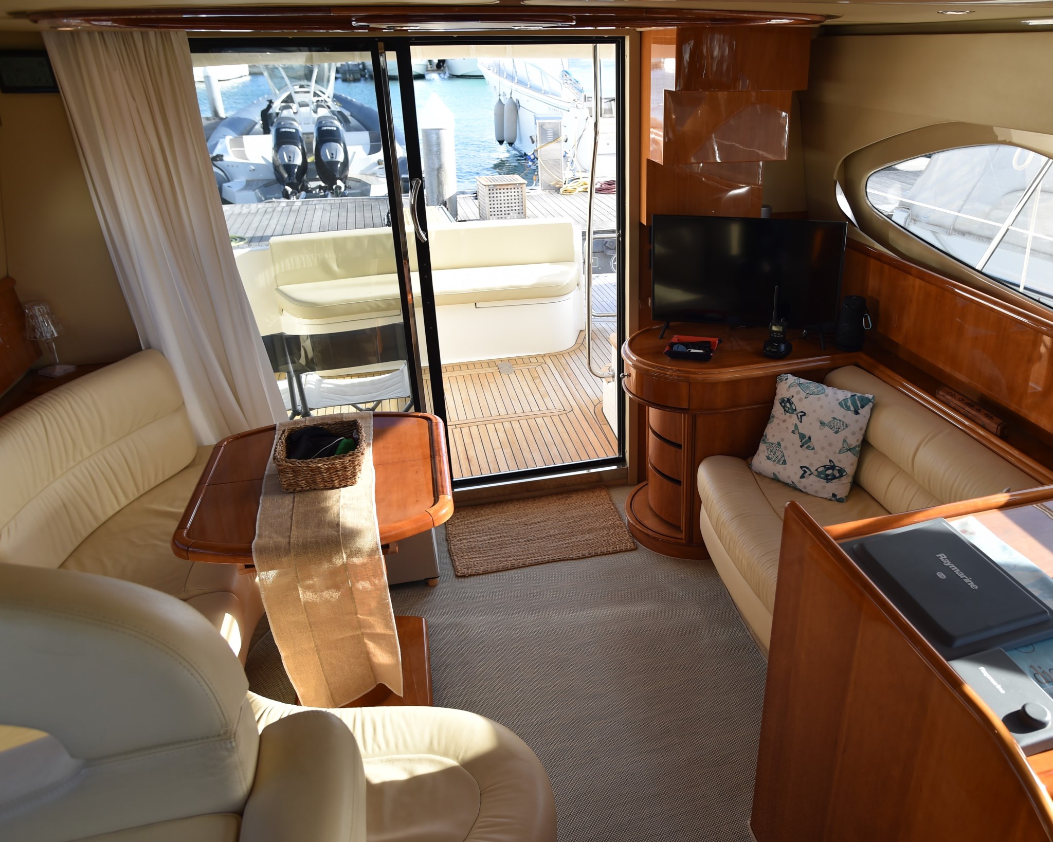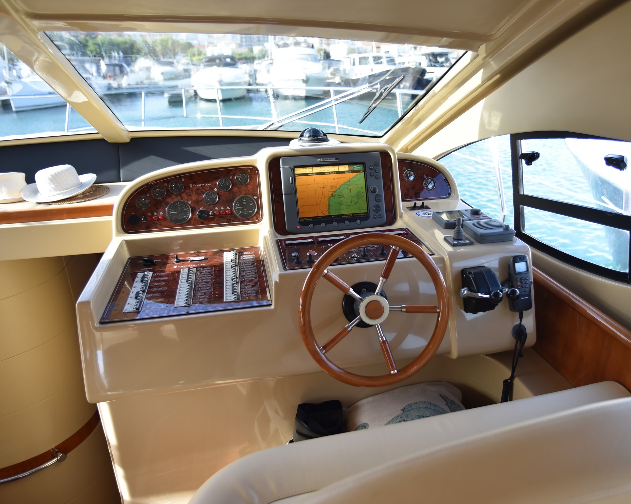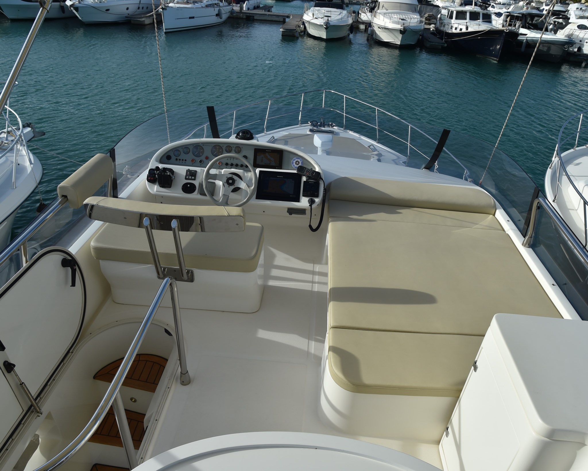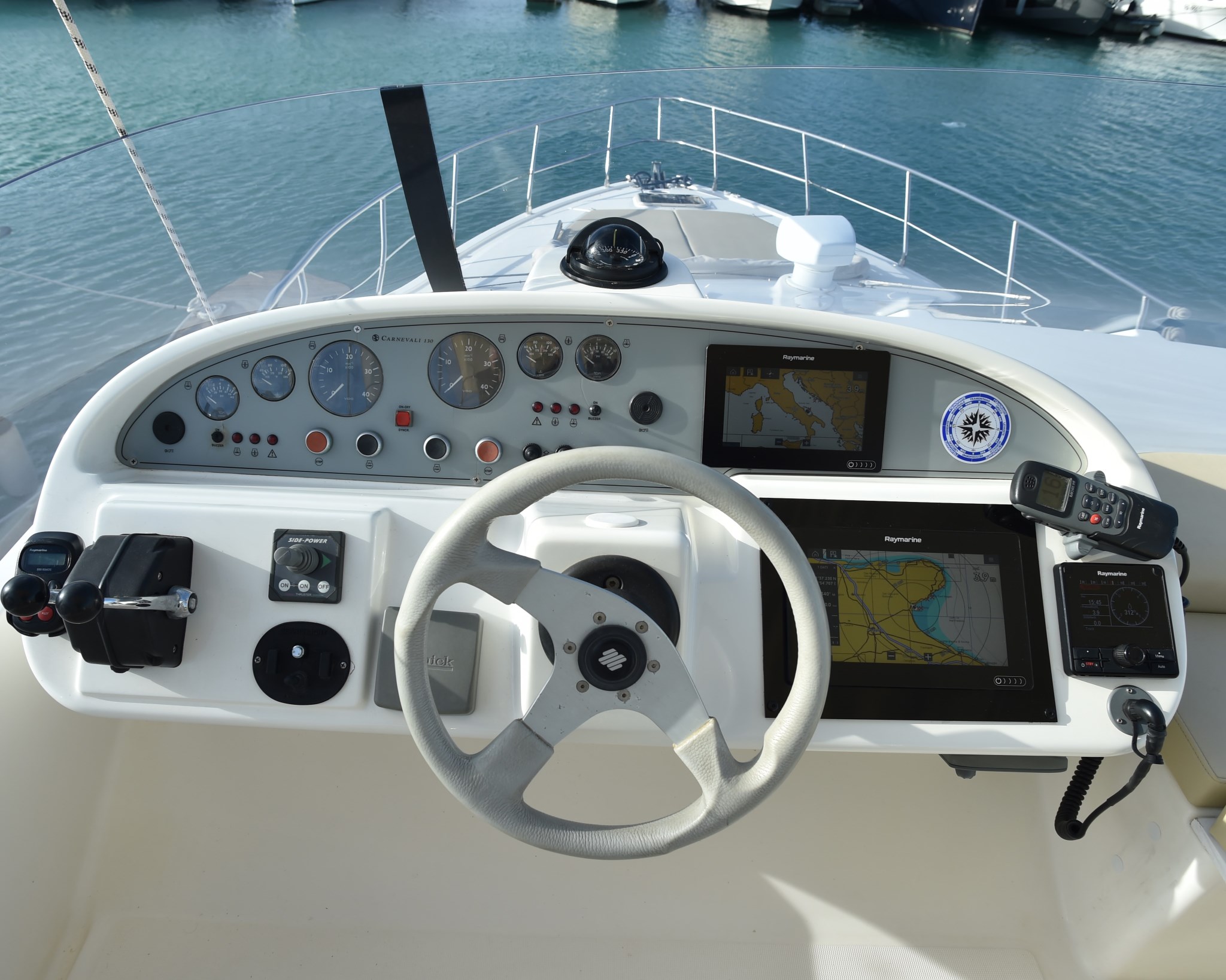 Antenna radar, Bussola, Contametri catena, Display, Ecoscandaglio (RAYMARINE), GPS (RAYMARINE), Luci di navigazione, Pilota automatico (RAYMARINE), Plotter con antenna GPS (RAYMARINE), Radar (RAYMARINE), Radio VHF (RAYMARINE).