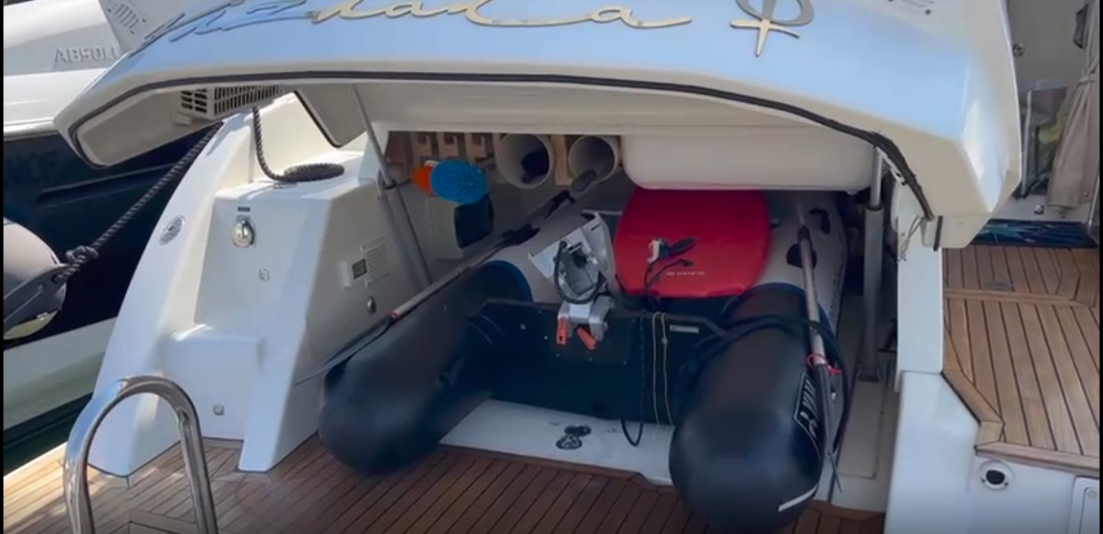 Ancora, Autoclave, Autogonfiabile, 8 x Batterie (7x100 Ah + 1x75 Ah), 2 x Caricabatterie, Doccia esterna, Flap idraulici, Garage per tender, Hard top, Indicatori Flaps, Lavandino nel Pozzetto, Luci di cortesia, Luci subacquee, Passerella (idraulica a scomparsa Besenzoni), Piattaforma (Teak), Pompa di sentina automatica, Pompa di sentina manuale, Pozzetto Teak, Presa 220V banchina, Presa acqua banchina, Raddrizzatore, Salpa Ancore Elettrico, Scaletta da bagno, Tavolo pozzetto, Tavolo Salone Abbattibile.