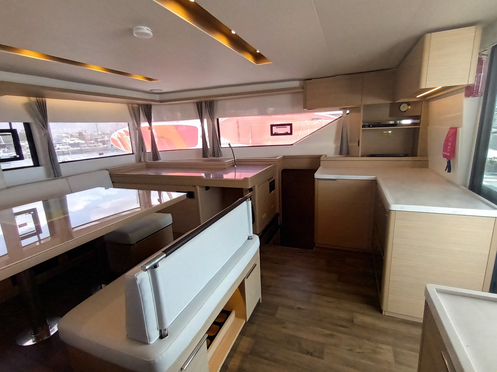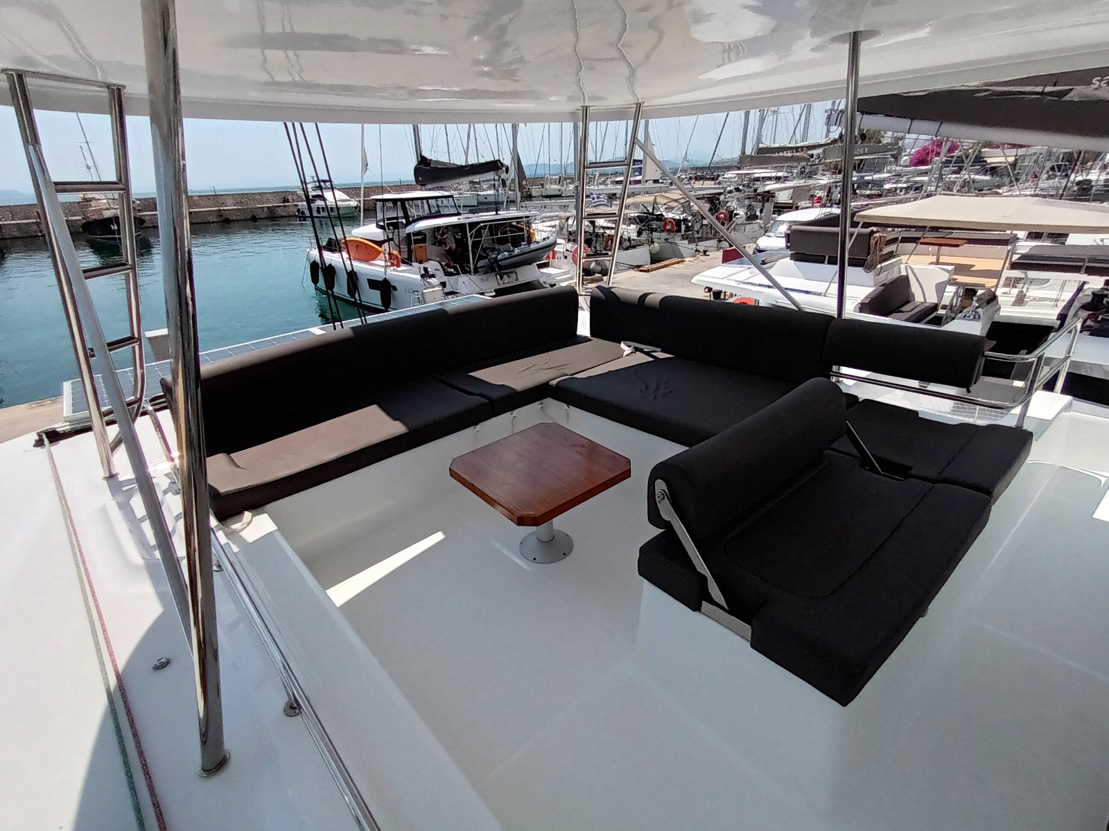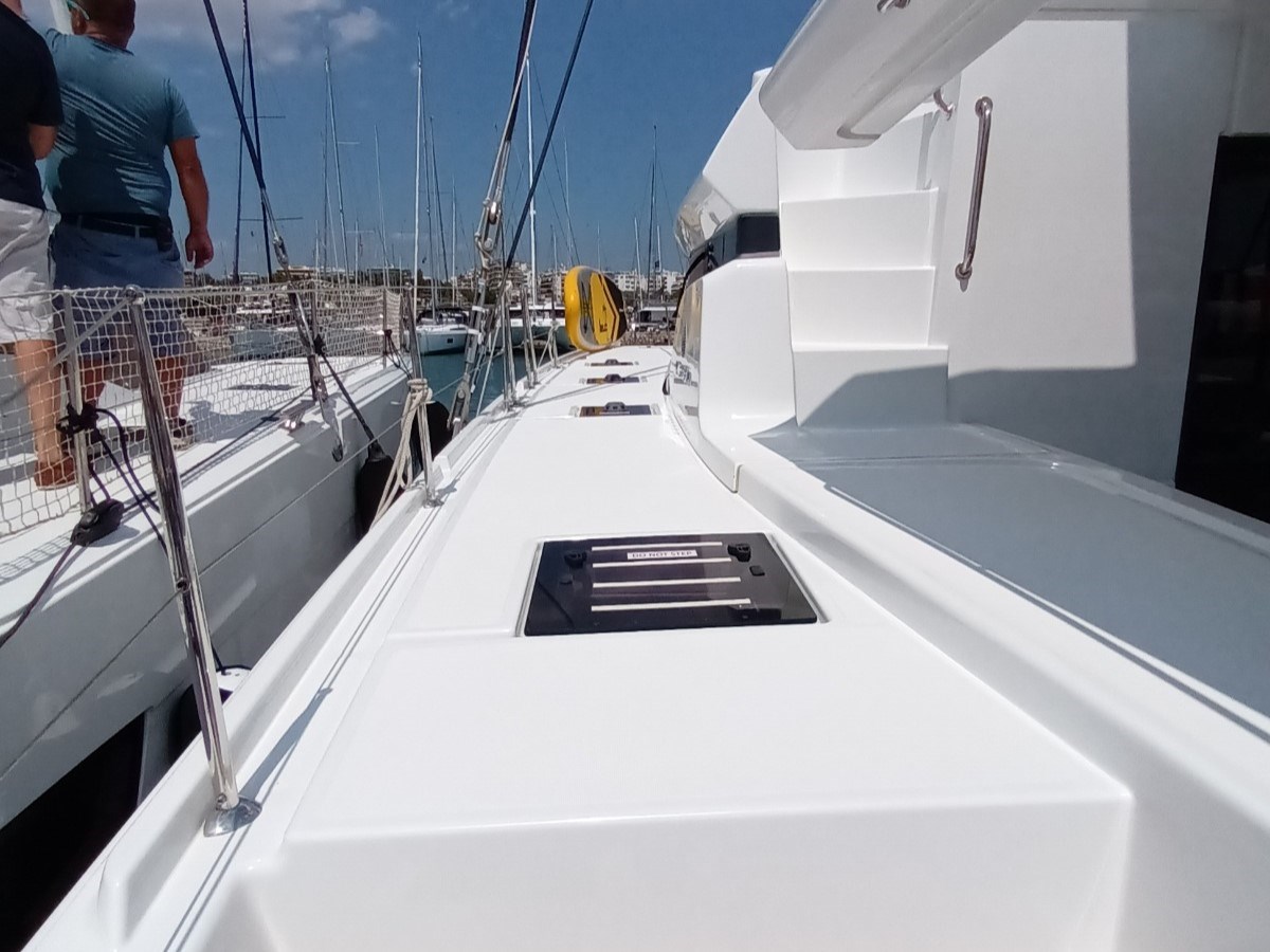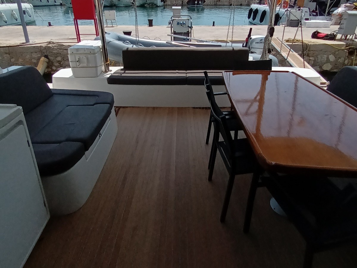 Allarme motore, Allarme sentina, Alternatore, 2 x Ancora (45 kg con 90 m di catena + ancora con 20 m di catena), Autoclave, Batterie, Caricabatterie, Doccia esterna, Gruette per tender, Lavandino nel Pozzetto, Monitor batteria, 2 x Pannelli Solari (305W), Passerella (idraulica 3m), Pompa di sentina automatica, Pompa di sentina manuale, Porta ingresso, Pozzetto Teak, Presa 220V banchina, Presa acqua banchina, Salpa Ancore Elettrico, Sartiame spiroidale, Scaletta da bagno, Tavolo pozzetto, Tender, Winch Elettrico, Windex.