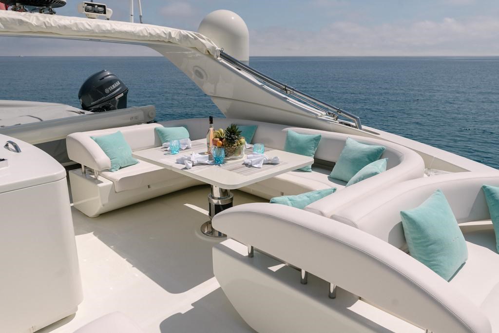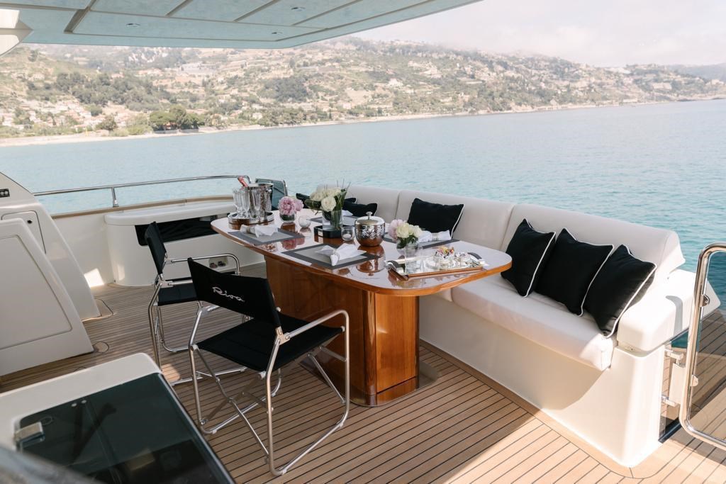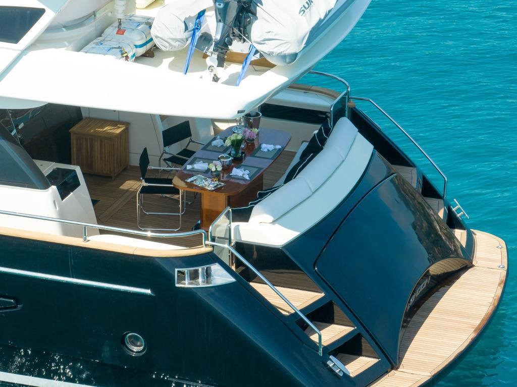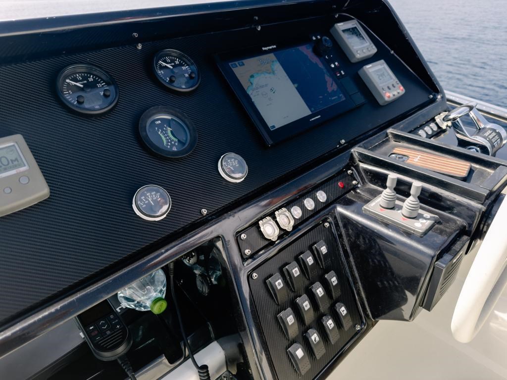 Ancora, Autoclave, Batterie, Camminamenti laterali in teak, Caricabatterie, Doccia esterna, Doppia timoneria, Elica di poppa - stern thruster, Elica di prua - bow thruster, Faro orientabile, Gruette per tender, Luci di cortesia, Luci subacquee, Passerella, Pozzetto Teak, Scaletta da bagno, 2 x Stabilizzatori (Mitsubishi), Tavolo pozzetto, Winch.