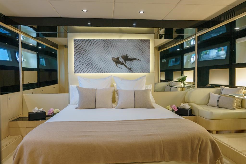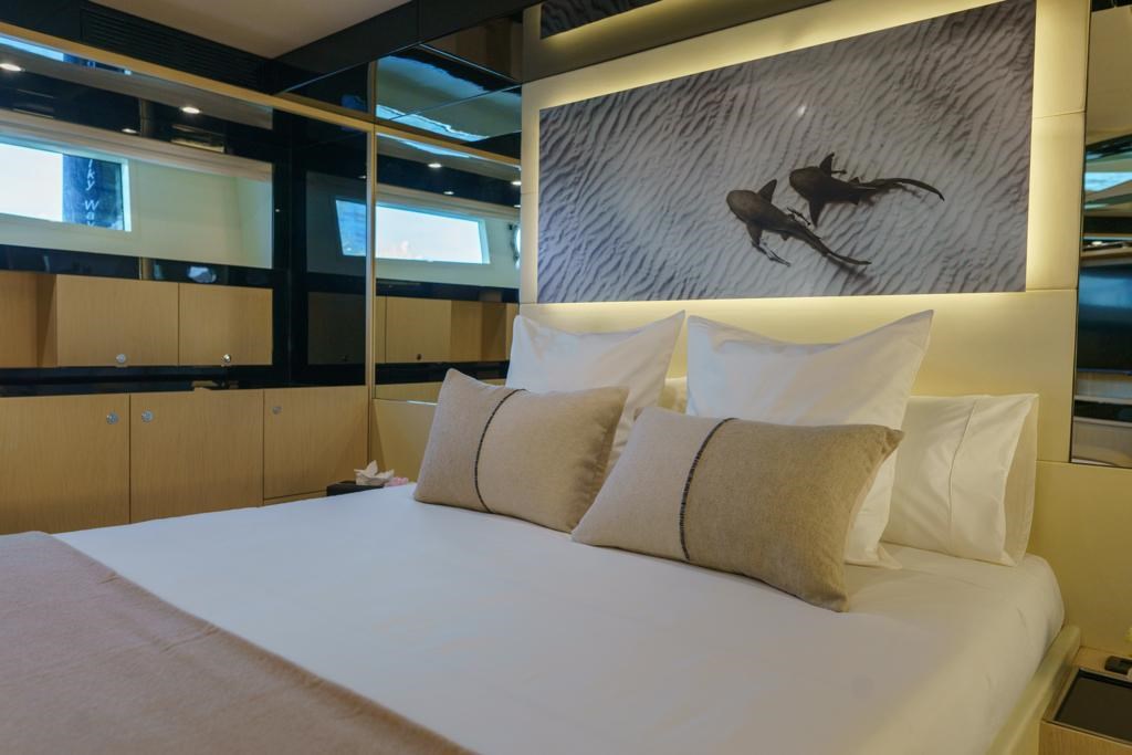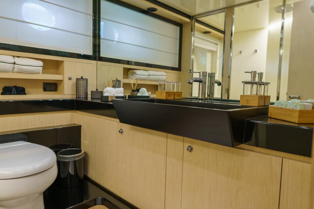 Nel lower deck troviamo quattro cabine ben arredate, tra cui la cabina armatoriale a tutto baglio, una cabina VIP e due cabine doppie, tutte con bagno privato.
