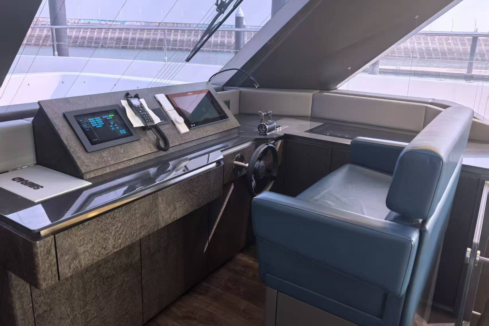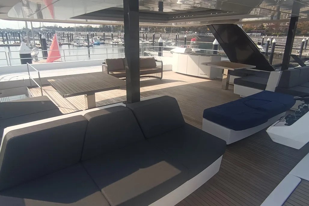 Il flybridge ha un layout aperto e offre aree relax, ampi prendisole e un angolo bar con barbecue