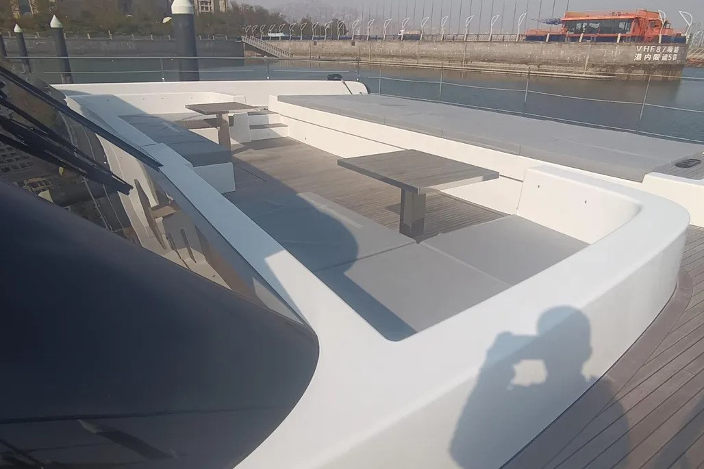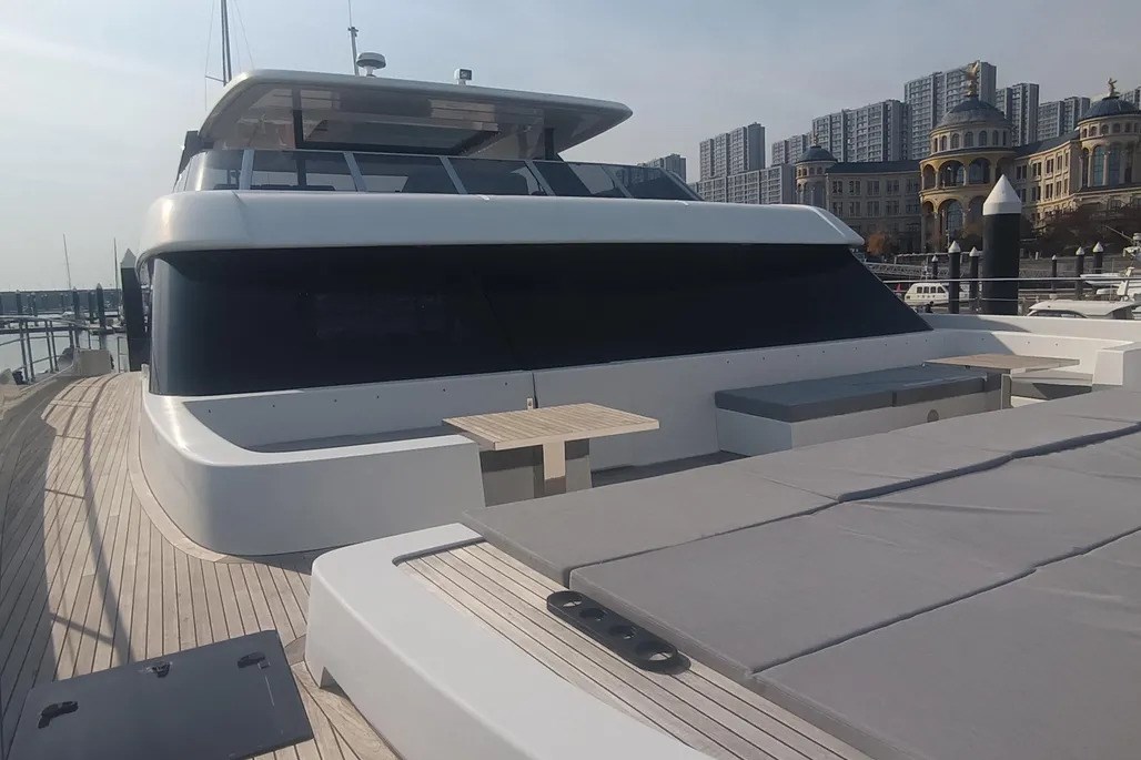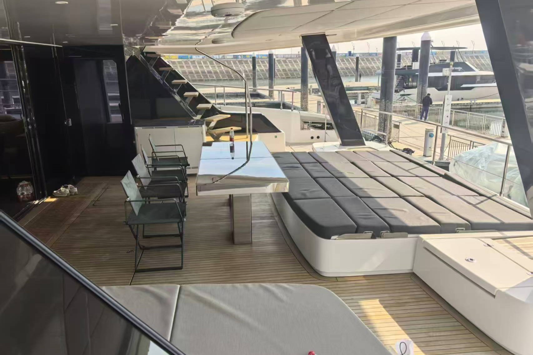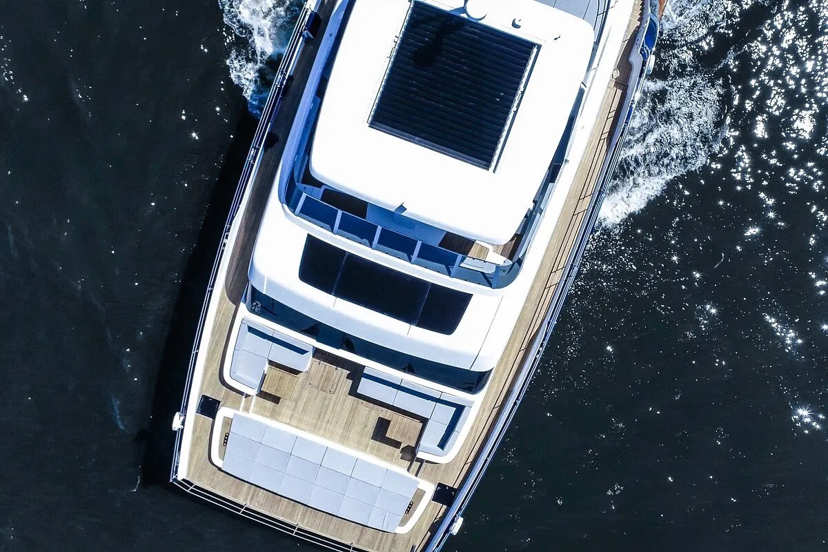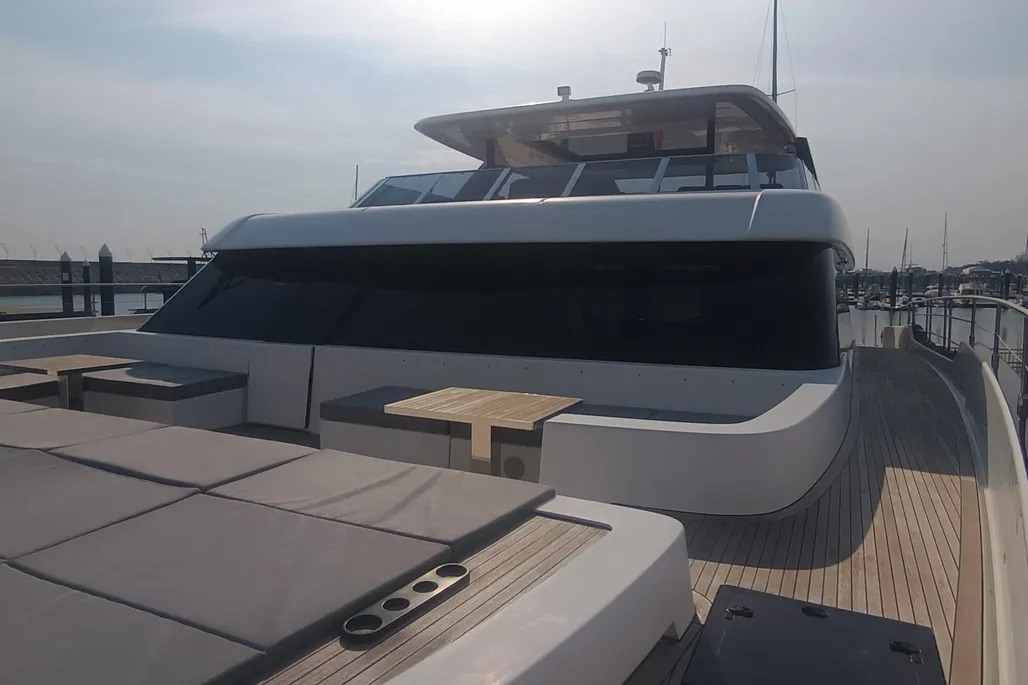 Il pozzetto di poppa offre ampi spazi per il relax e la zona pranzo. Sotto il divano modulare, il garage ospita un grande jet ski e giochi d'acqua, mentre la piattaforma da bagno idraulica ospita il tender e offre ulteriore spazio per rilassarsi in riva al mare