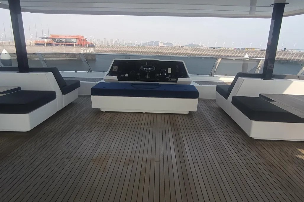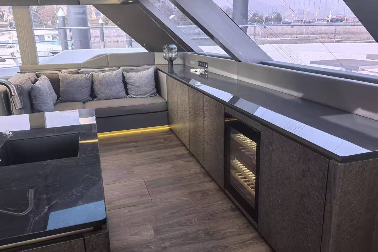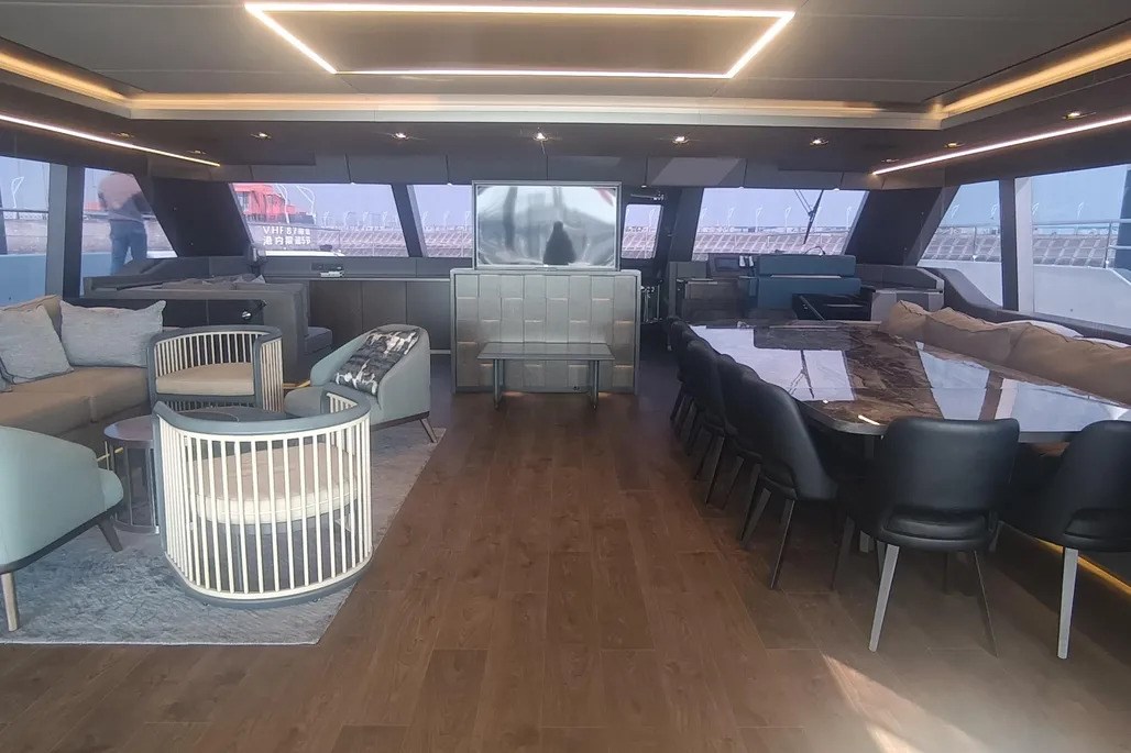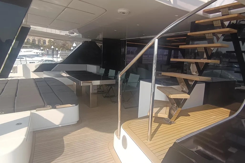 Il ponte principale comprende un ampio divano e un tavolo da pranzo che può ospitare fino a 12 persone, mentre a prua si trova un accogliente angolo lettura e un angolo bar ben attrezzato all'ingresso del ponte di prua