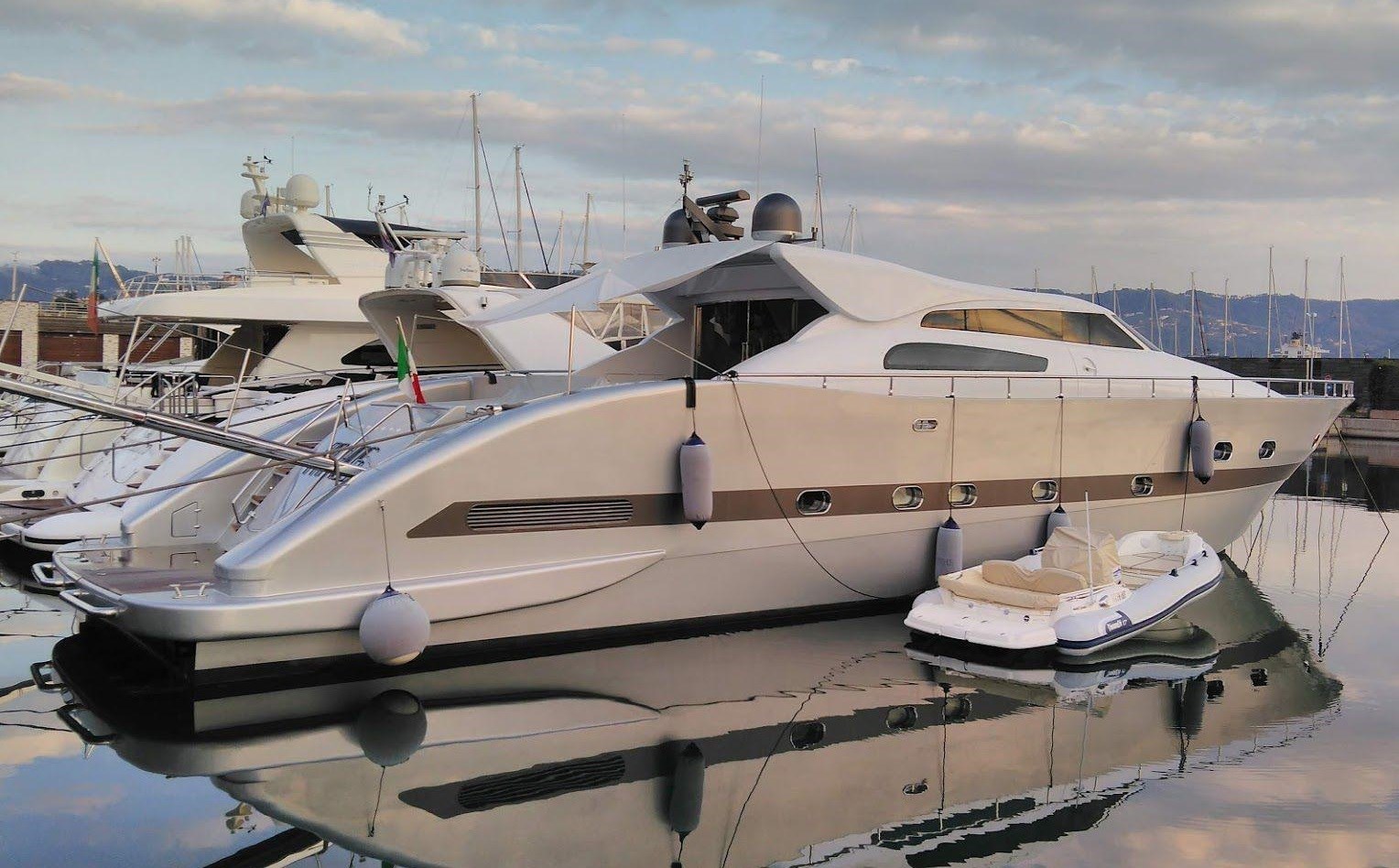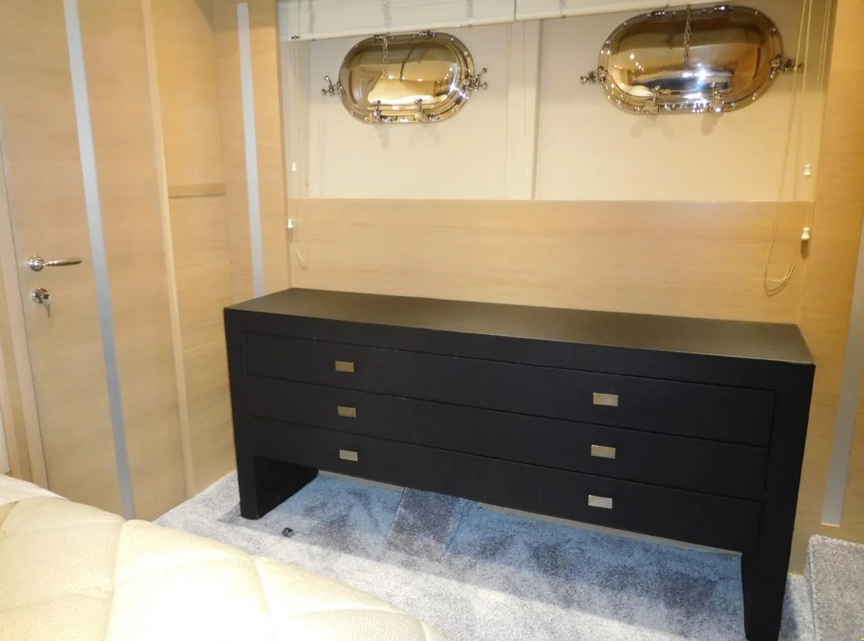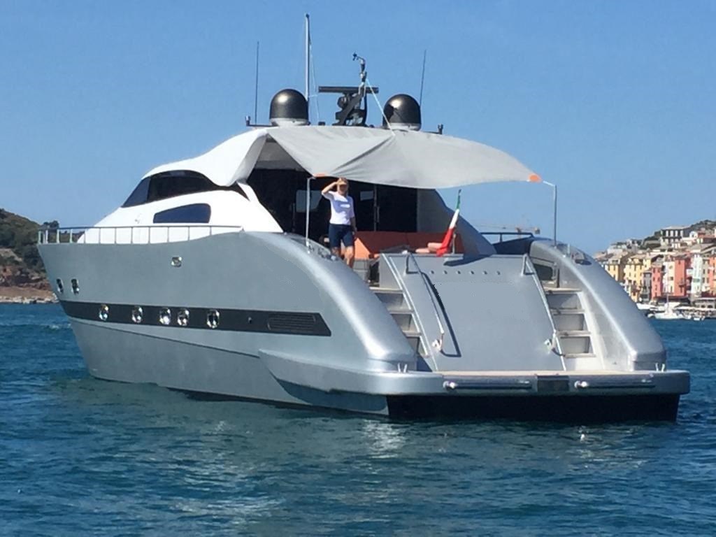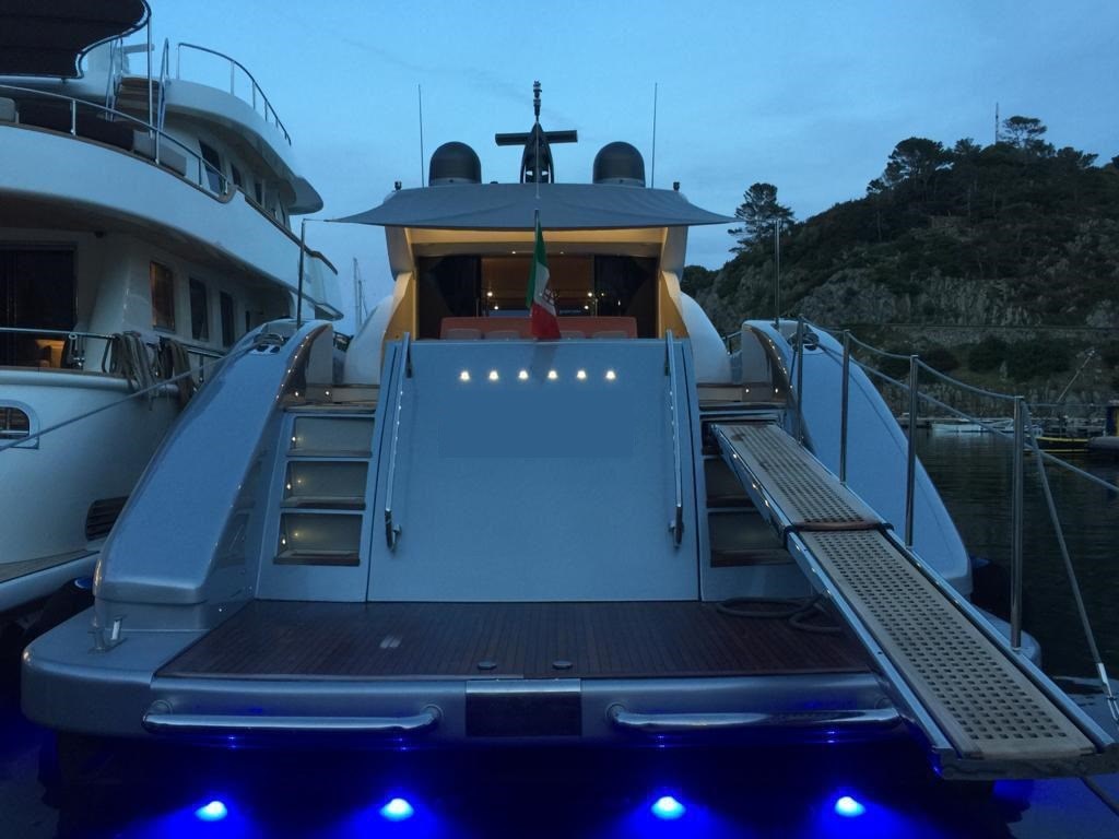 Allarme fumo/gas, Allarme motore, Allarme sentina, Alternatore, Ancora, Autoclave, Batterie, Camminamenti laterali in teak, Caricabatterie, Cavo corrente di banchina, Colorazione speciale (ARGENTO METALLIZZATO), Corrimano, Doccia esterna, Elica di prua - bow thruster, Flap idraulici, Garage per tender, Gruette per tender, Hard top, Impianto antincendio, Indicatori Flaps, Luci di cortesia, Luci subacquee, Passerella, Piattaforma, Pompa di sentina automatica, Pompa di sentina elettrica, Pompa di sentina manuale, Ponte in teak, Porta ingresso, Porta laterale, Pozzetto Teak, Presa 220V banchina, Salpa Ancore Elettrico, Scaletta da bagno, Tavolo pozzetto, Tientibene con cancelletti, Tromba, Winch tonneggio di poppa.